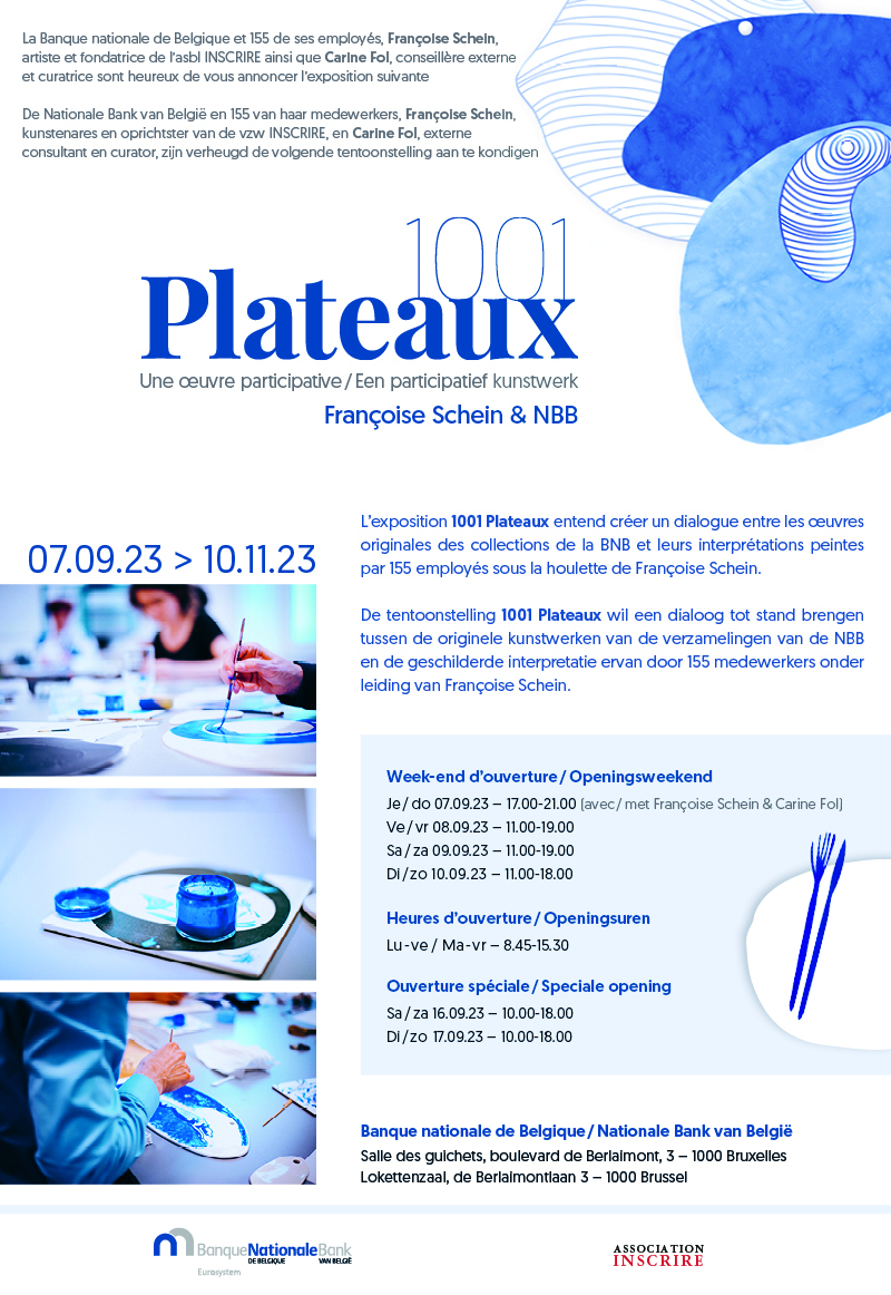 De tentoonstelling 1001 Plateaux wil een dialoog tot stand brengen tussen de originele kunstwerken van de verzamelingen van de NBB en de geschilderde interpretatie ervan door 155 medewerkers onder leiding van Françoise Schein.